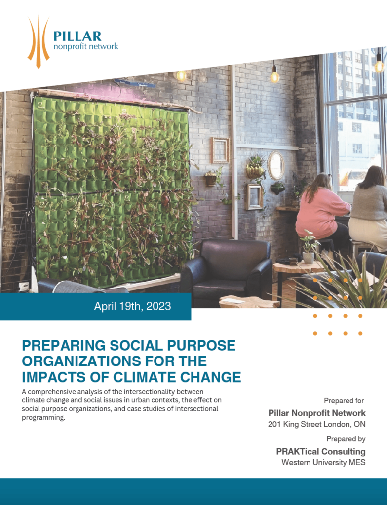 The effects of climate change are widespread, leading to long-term social, economic, and environmental impacts. For mid-sized Canadian cities, some of the major environmental impacts include food insecurity, extreme weather resilience, and environmental pollution. Understanding the intersectionality between social issues in the urban sector and climate change allows organizations to create targeted and effective climate action programs. The primary relationships identified in this report are between climate change and social issues such as poverty, racial inequalities, mental health, climate migration, and food access. This analysis explores the relationship between these topics and the ways in which social purpose organizations in Canada are impacted by a multitude of intersections. Information and recommendations from this report can be applied to any mid-sized city in Canada. Five social purpose organizations that have implemented socio-environmental intersectional programming were researched and interviewed for this report.